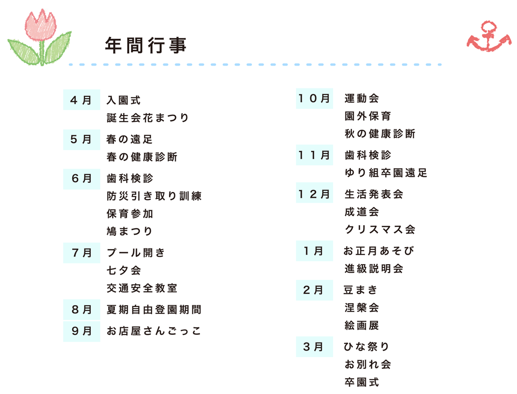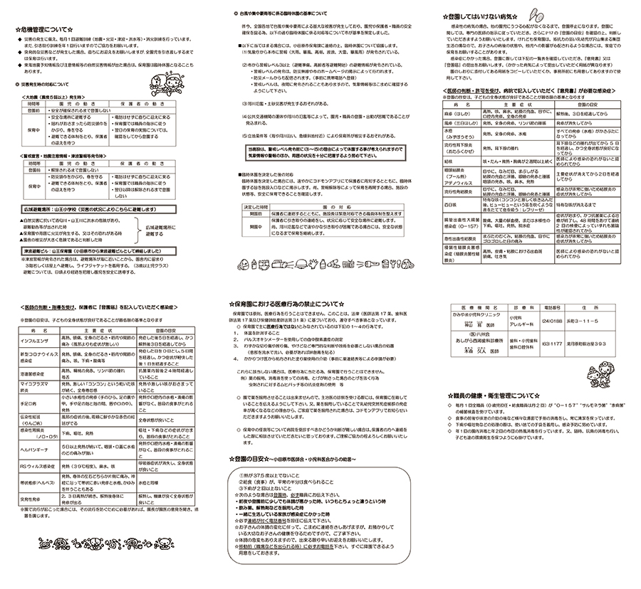 • 東海地震予知情報及び注意情報等の自然災害情報が出た場合は、保育園は臨時休園となることもあります。