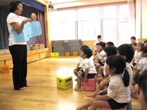 毎月1回、専門の講師の方をお招きし、音楽指導を行っています。0~5歳までの年齢の発達に合わせた指導内容が組み込まれているため、子どもたちの好奇心が惹き出され笑顔があふれる時間となります。