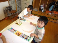 4・5歳児は月に2回、講師の方をお招きし、絵画指導を行っています。テーマのあるものに沿って考え、様々な色や形、素材に触れることで感性が豊かになり、自分のイメージするものを表現できるようになります。